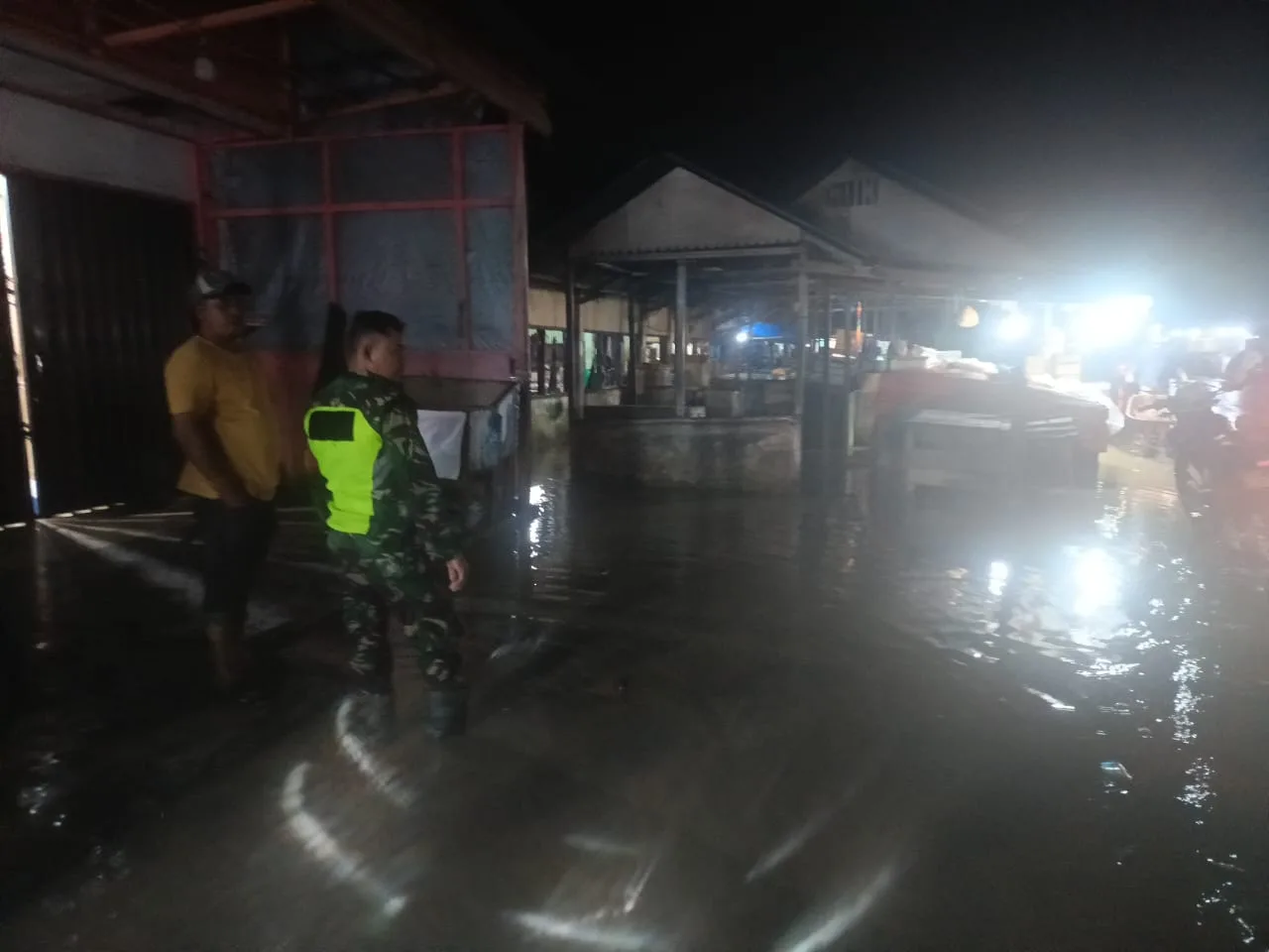 Dalam kegiatan tersebut, Babinsa menyusuri area sekitar bantaran sungai serta titik-titik rawan genangan guna memperoleh gambaran langsung dampak luapan air sungai.