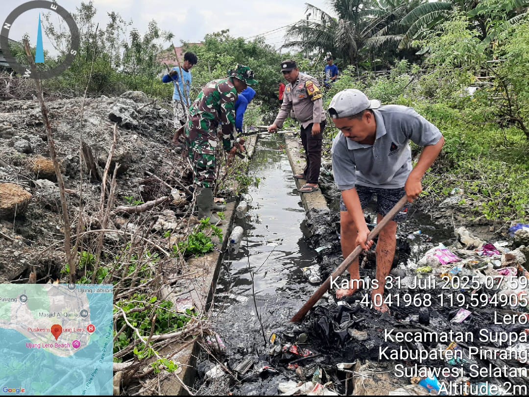 Pinrang_ Untk menjaga kebersihan Lingkungan, Koramil-01/Suppa Kodim 1404/Pinrang menggelar kerja bakti bersama Staf Kelurahan, Bhabinkamtibmas dan warga dengan sasaran pembersihan saluran air di Dusun Butung Desa Lero Kecamatan Suppa Kabupaten Pinrang, Jum’at (01/08/2025).