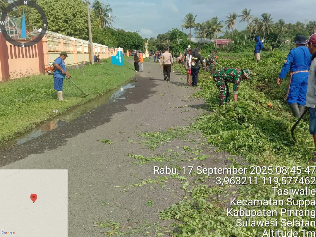 Pinrang_ Untk menjaga kebersihan Lingkungan, Koramil-01/Suppa Kodim 1404/Pinrang menggelar kerja bakti bersama warga dengan sasaran pembersihan pembersihan saluran air di Desa Tassiwalie Kecamatan Suppa Kabupaten Pinrang, Rabu (17/09/2025).