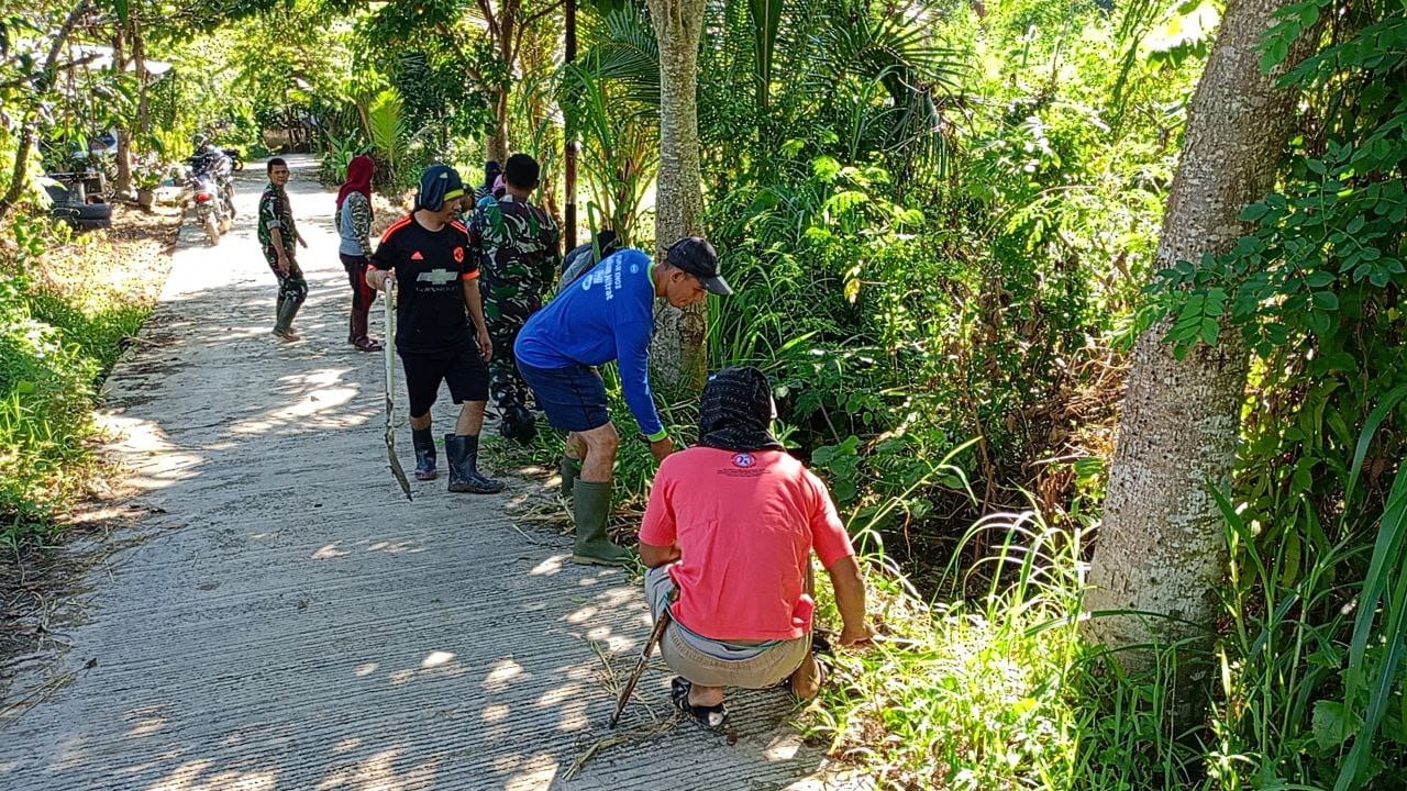 Tampak anggota Koramil bersama masyarakat bersemangat membersihkan sampah dan rumput-rumput liar di selokan, untuk kemudian dibuang ke tempat sampah yang tersedia.