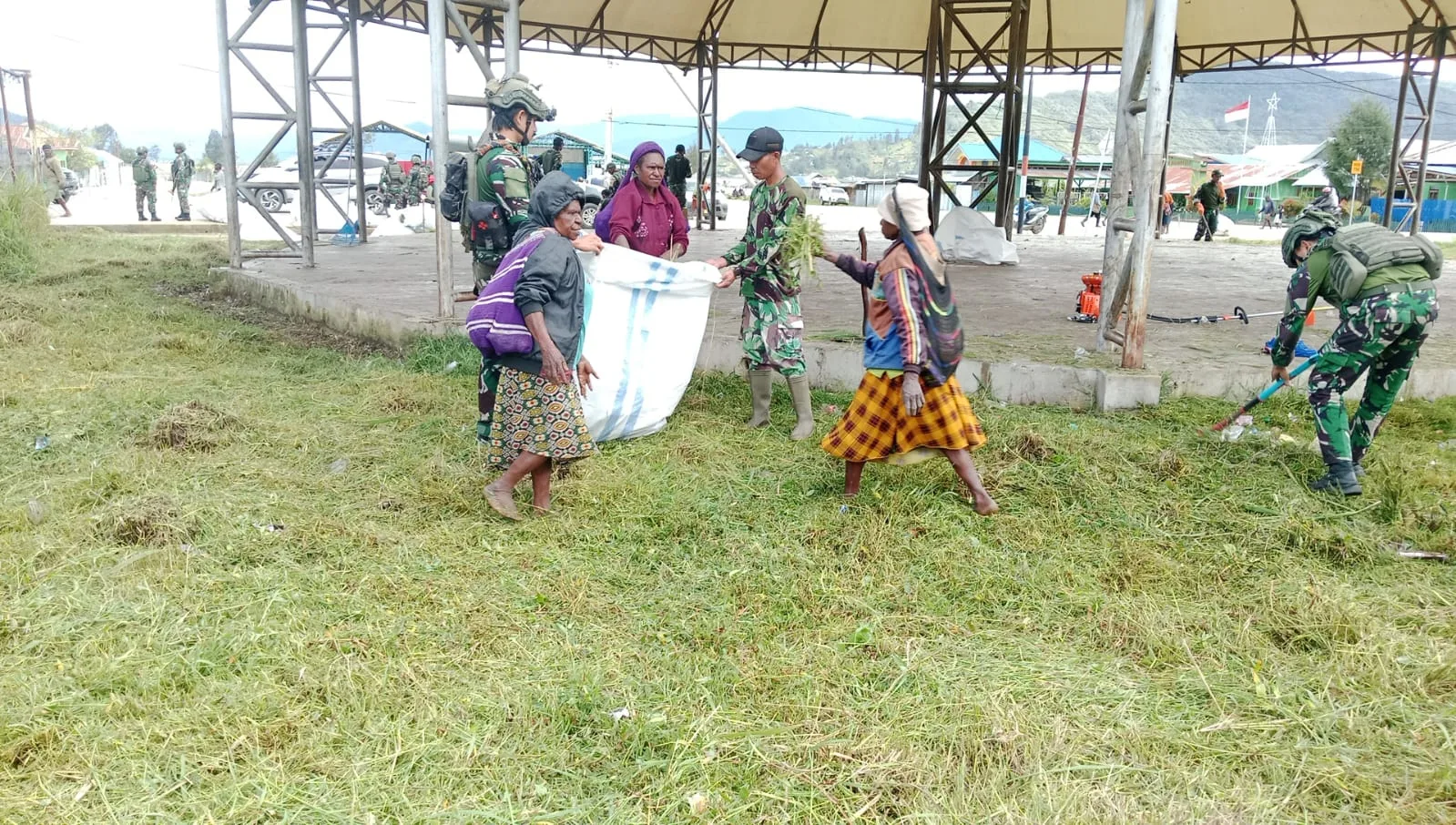 Personel gabungan TNI bersama masyarakat tampak antusias dan bergotong royong membersihkan sampah, memotong rumput liar, serta merapikan fasilitas umum. Kehadiran aparat TNI di tengah masyarakat diharapkan dapat mempererat hubungan silaturahmi dan meningkatkan semangat kebersamaan.