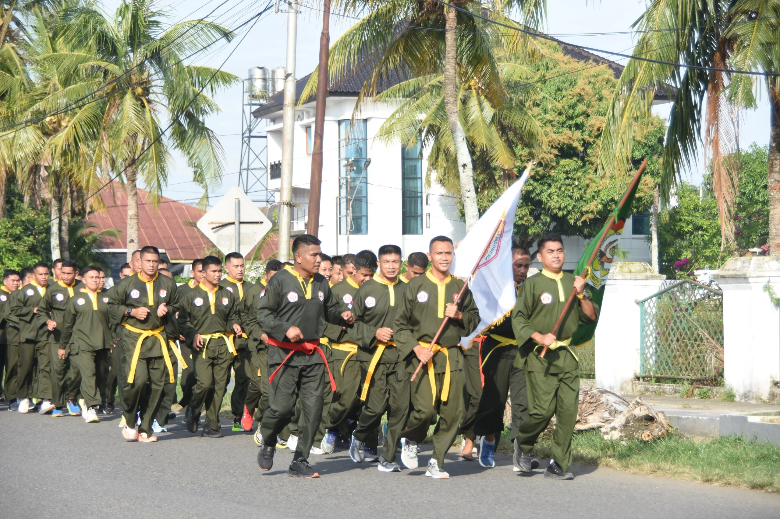Sebelum memasuki materi inti pencak silat militer, seluruh personel terlebih dahulu melaksanakan pembinaan fisik berupa lari di luar asrama Makorem 141/Tp. Kegiatan ini bertujuan untuk meningkatkan daya tahan tubuh dan kesiapan fisik prajurit sebelum mengikuti latihan lanjutan.