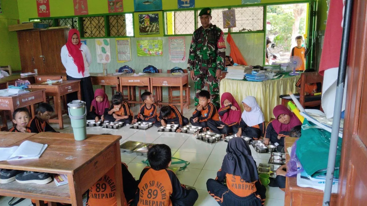 KODIM 1405/PAREPARE – Bentuk dukungan dalam dunia pendidikan, Personel Babinsa Koramil 1405-01/Ujung Sertu Muhammad Ali melaksanakan pendampingan Makan Bergizi Gratis (MBG) di beberapa Sekolah Dasar (SD) dan Sekolah Menengah Pertama (SMP) yang ada di Kecamatan Ujung, Kota Parepare. Rabu (8/10/2025)