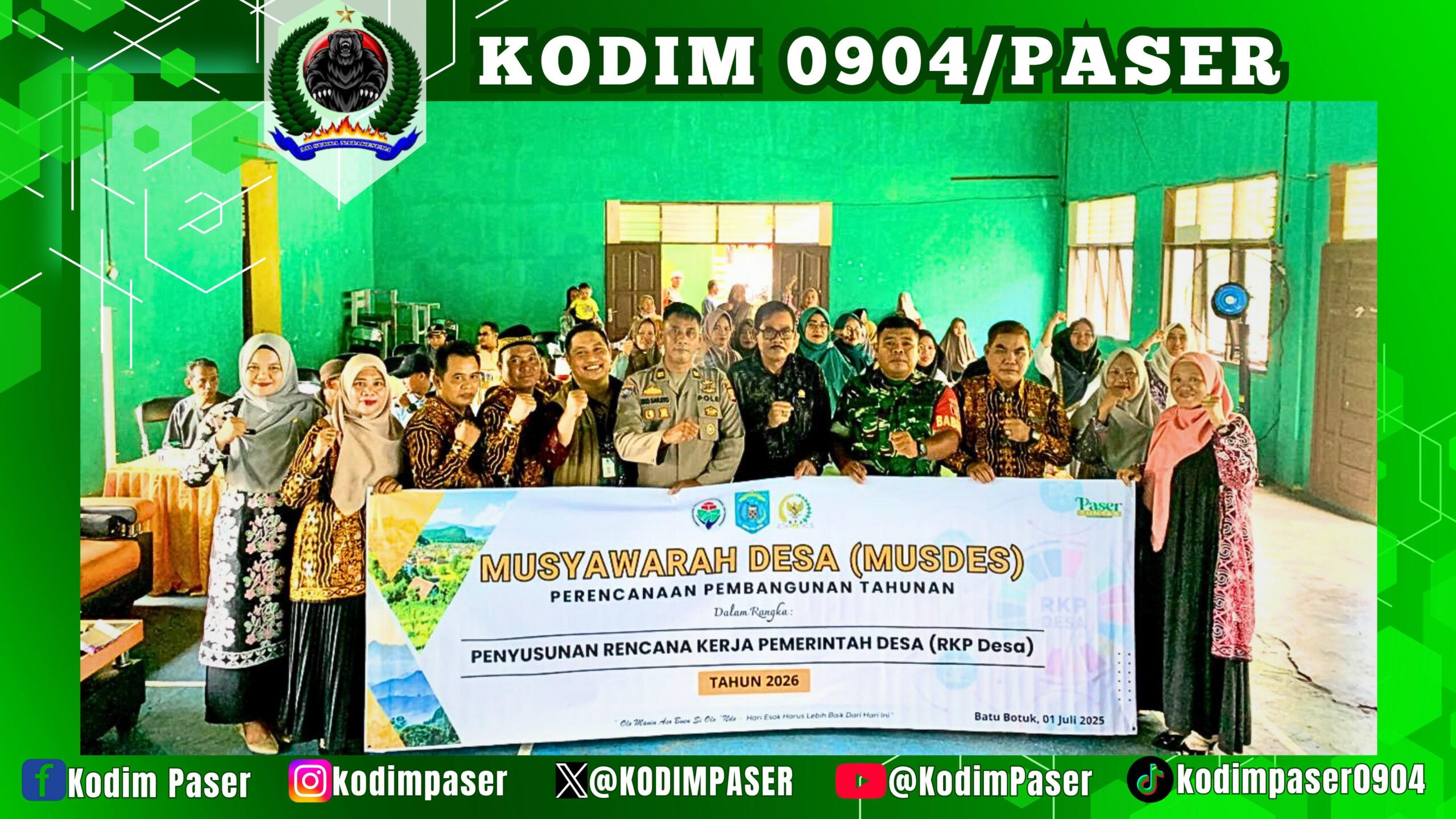 Kodim 0904/Psr, Korem 091/ASN, Kodam VI/Mlw – Babinsa Desa Batu Botuk Koramil 0904-07/Muara Komam, Serka Asman mengikuti kegiatan Musyawarah Desa (Musdes) Penyusunan Perencanaan Pembangunan Tahunan Desa Batu Botuk bertempat di Gedung Serbaguna Desa Batu Botuk, Kec. Muara Komam, Kab. Paser. Sabtu (5/7/2025)