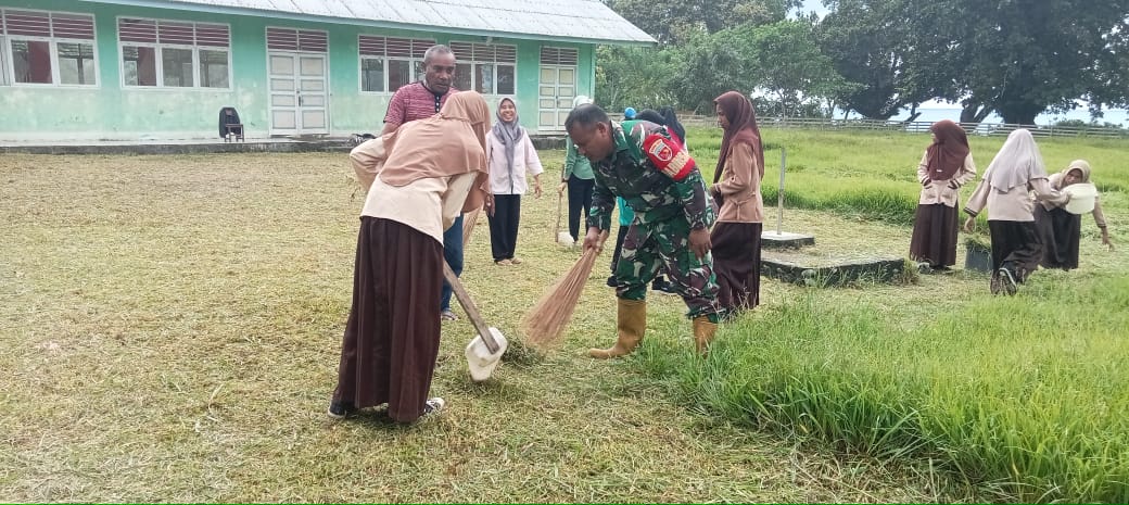 Melihat kondisi halaman sekolah yang sudah ditumbuhi rumput dan pepohonan yang tinggi, hal ini menggugah hati anggota Babinsa Koramil 1502 – 07/werinama Serma Moh Aviv Sikdewa, untuk ikut peduli serta membantu membersihkan halaman Sekolah tersebut,kegiatan bersih-bersih ini guna menumbuhkan keakraban antara anggota Babinsa dengan pihak sekolah serta mengajak para siswa agar mencintai kebersihan pada lingkunga,”