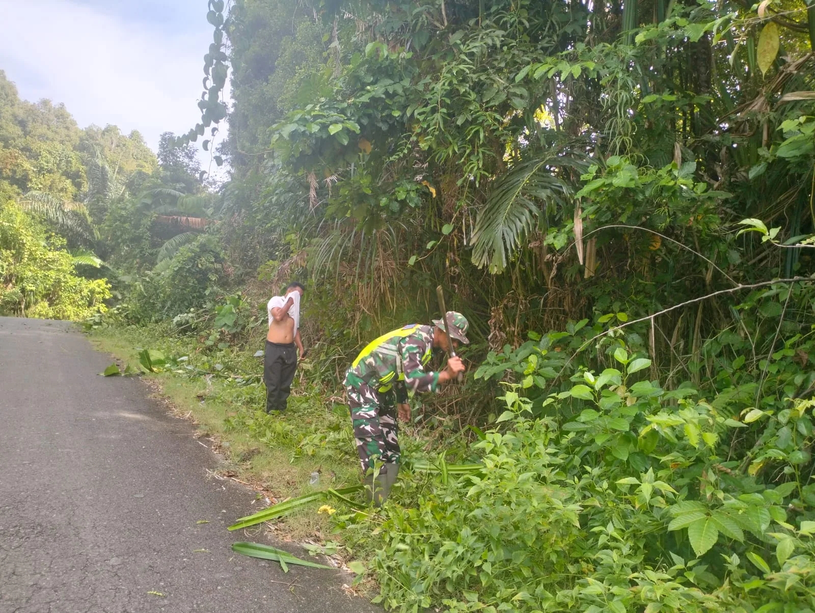 Babinsa Gotong Royong Membersihkan Jalan Bersama Warga Desa
