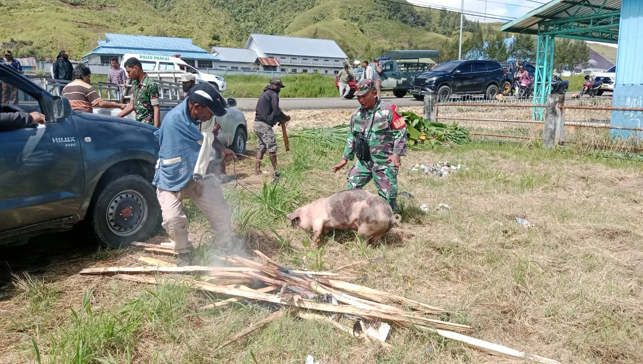 Paniai – Babinsa Koramil 1703-01/Enarotali Sertu Yulius Toni Limbong turut hadir dan terlibat langsung dalam kegiatan adat bakar batu yang dilaksanakan oleh masyarakat di Distrik Paniai Timur. Kehadiran Babinsa merupakan bentuk dukungan dan wujud nyata kebersamaan antara TNI dan masyarakat dalam menjaga serta melestarikan budaya lokal.