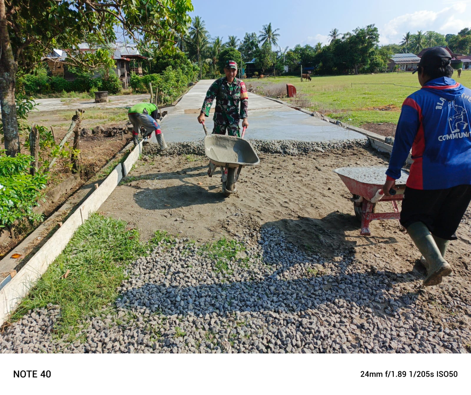 Pada gotong royong tersebut, Serma Edy Purwanto memegang gerobak untuk membawa material bersama warga. Material itu untuk memperkeras jalan desa di wilayah binaan.