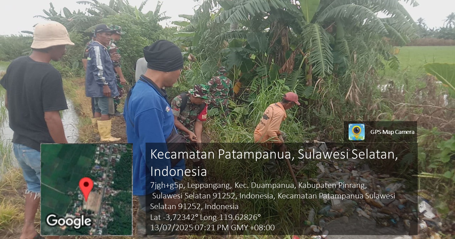 Pinrang_ Dalam rangka mendukung kelancaran pengairan lahan pertanian dan sebagai bentuk kepedulian terhadap kesejahteraan petani, Babinsa Koramil-05/Patampanua Kodim 1404/Pinrang melaksanakan kegiatan kerja bakti bersama warga dengan sasaran membersihkan saluran irigasi di area persawahan Desa Leppangan Kecamatan Patampanua Kabupaten Pinrang, Minggu (13/10/2025).