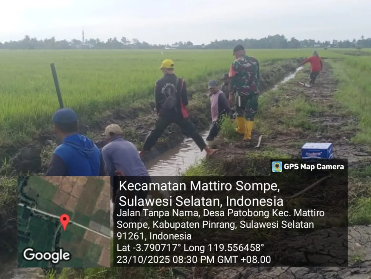 Pinrang_ Babinsa Koramil 1404-02/Mattiro Sompe Kodim 1404/Pinrang bersama warga masyarakat melaksanakan kegiatan kerja bakti pembersihan saluran air persawahan yang bertempat di Dusun Tanete, Desa Patobong, Kecamatan Mattiro Sompe, Kabupaten Pinrang, Kamis (23/10/2025).