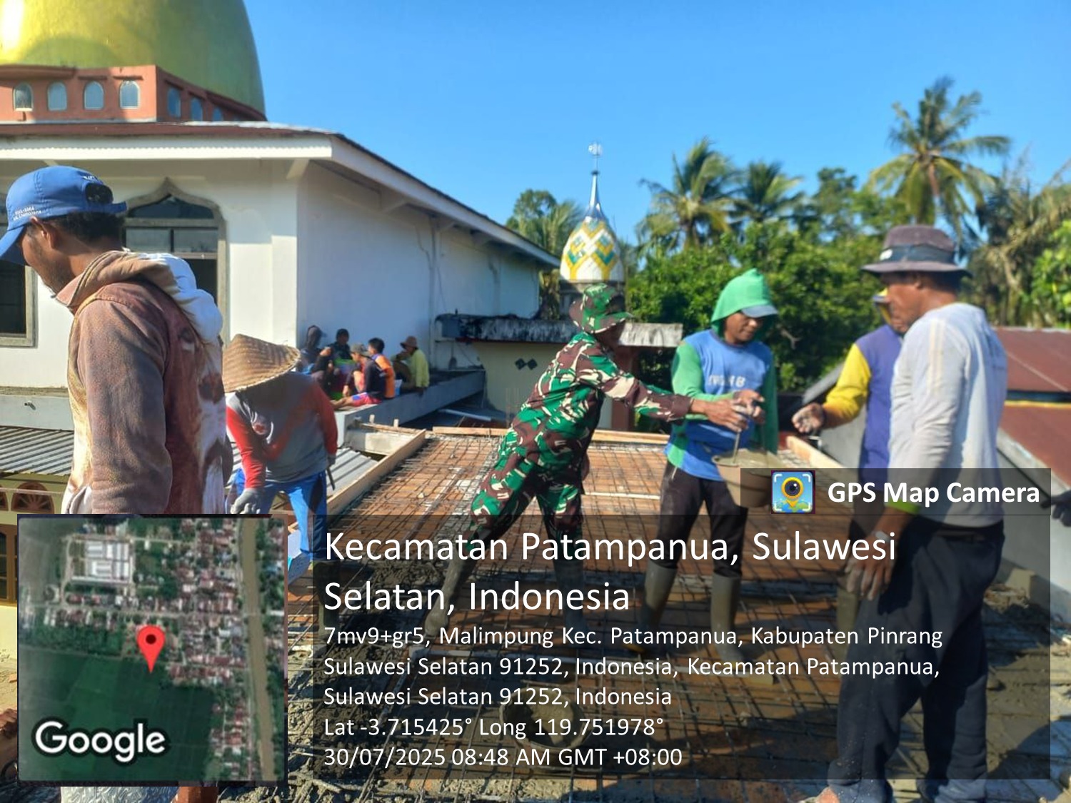 Pinrang_ Wujud kepedulian TNI terhadap pembangunan sarana ibadah masyarakat ditunjukkan oleh Babinsa Koramil-05/Patampanua Kodim 1404/Pinrang Sertu Deni Agus Subroto yang melaksanakan kegiatan gotong-royong bersama warga dalam pengecoran lantai atas Masjid Nurul Amrullah di Desa Malimpung Kecamatan Patampanua Kabupaten Pinrang, Rabu (30/07/2025).