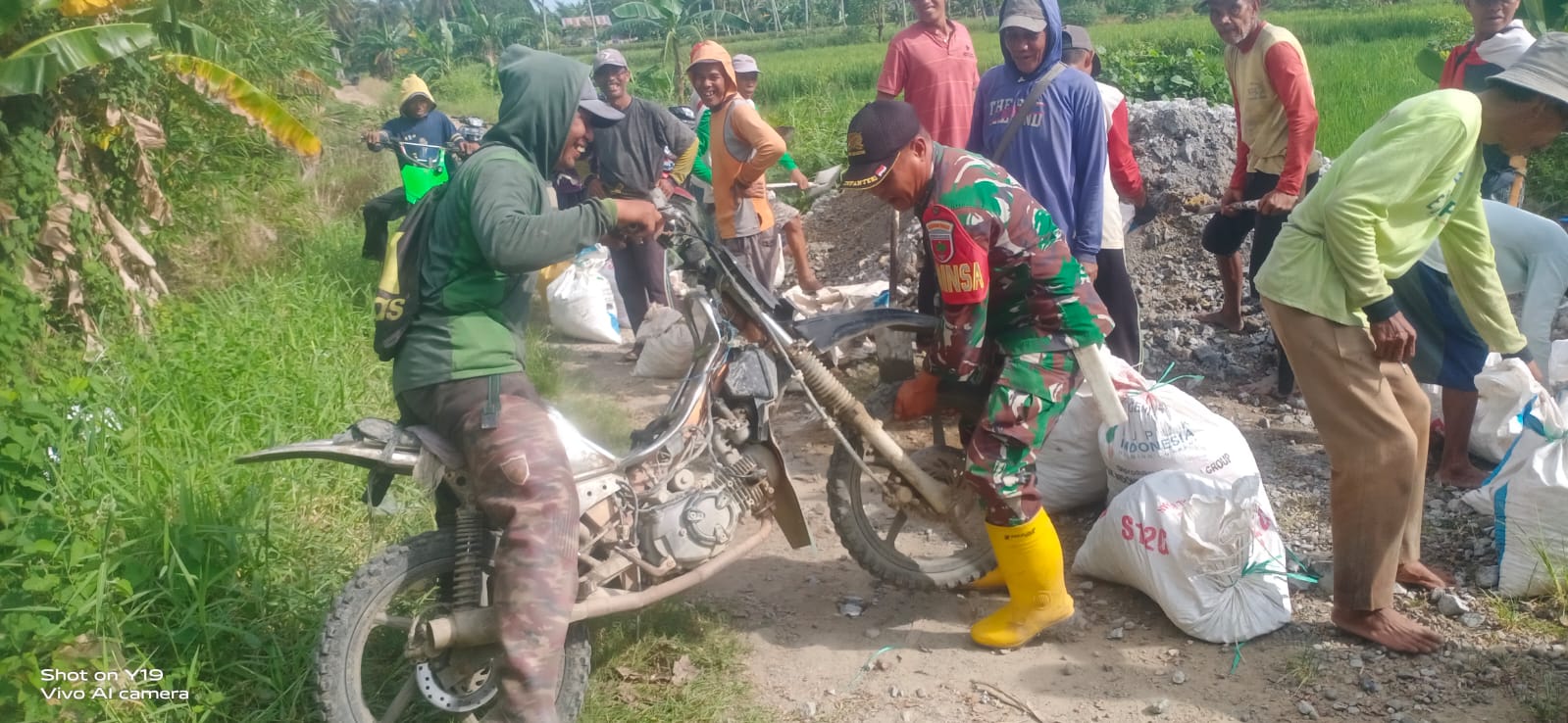 “Upaya nyata tersebut antara lain dengan cara terjun langsung bersama warga masyarakat melakukan kegiatan kerja bakti gotong royong melakukan penimbunan jalan tani, sehingga membuat warga nyaman untuk melewati jalan tersebut”, ungkap Babinsa.