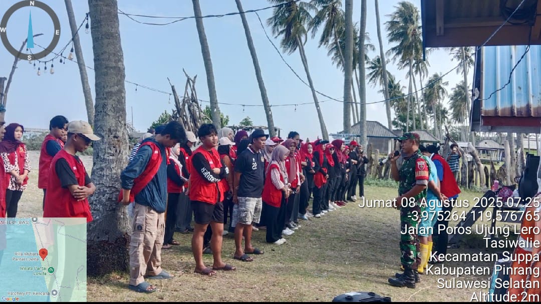 Pinrang_ Peduli kebersihan Lingkungan, Babinsa Koramil-01/Suppa Kodim 1404/Pinrang bersama Forkopimcam dan stake holder terkait lainnya dan warga setempat mengadakan kegiatan kerja bakti pembersihan pesisir Lowita di Desa Tassiwalie Kecamatan SUppa Kabupaten Pinrang, Sabtu (09/08/2025).