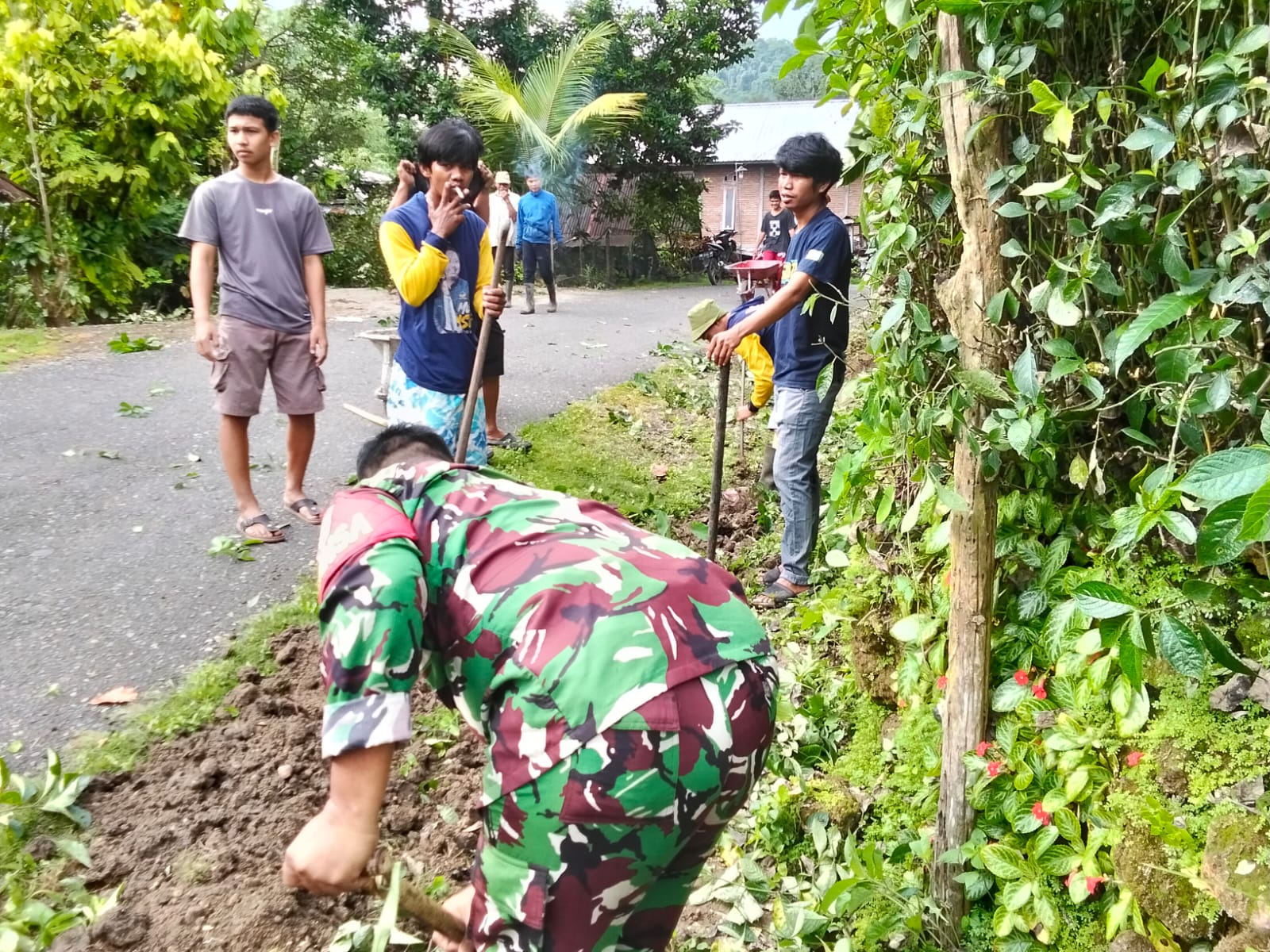 Kodim 1419/Enrekang Praka Helmi Babinsa koramil 02/Enrekang bersama masyarakat melaksanakan karya bakti membersihkan selokan dan tepi jalan sepanjang 150 meter di Lingk. Barani Kel. Tuara Kec. Enrekang Kab. Enrekang, Kamis (10/07/2025).