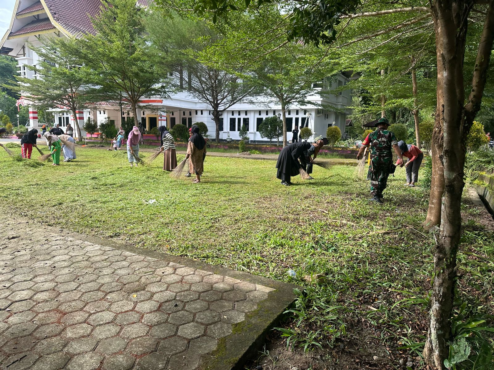 Danramil 1419-02/Enerkang Kapten Inf Zainal Bandaso mengatakan kegiatan kerja bakti pembersihan ranting-ranting dan memotong serta memangkas pohon yang ada di halaman sekitar kantor Kantor bupati yang sudah menutupi pandangan kantor.