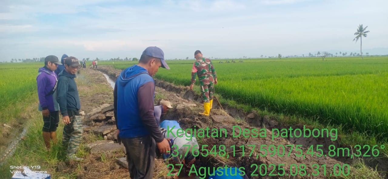 Pinrang_ Penuhi kebutuhan air persawahan petani, Babinsa Koramil-02/Mattiro Sompe Kodim 1404/Pinrang Serka Mustamin berbaur bersama warga melaksanakan gotong-royong pembersihan saluran irigasi di Desa Patobong Kecamatan Mattiro Sompe Kabupaten Pinrang, Rabu (27/08/2025).