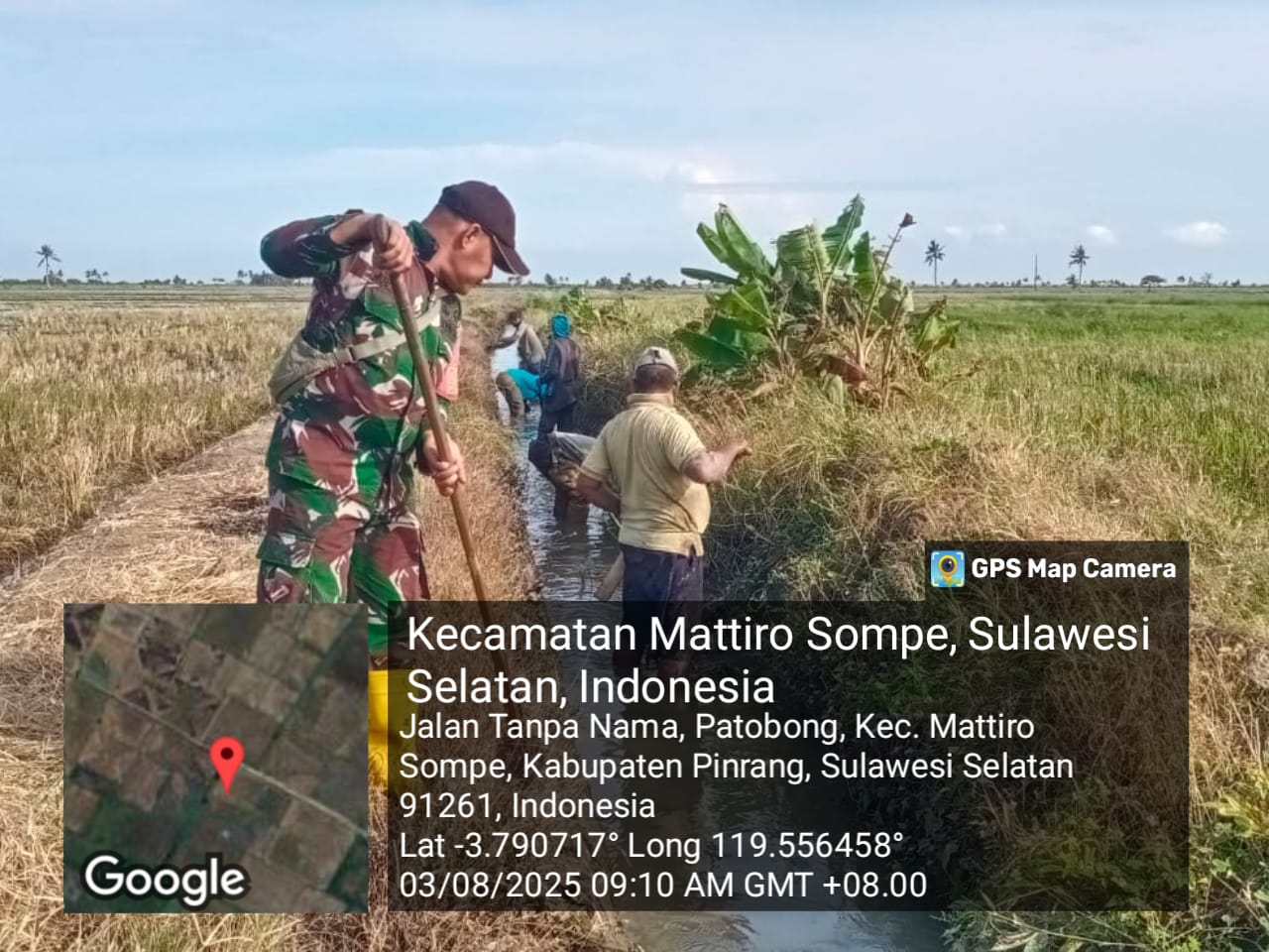 Pinrang_ Untuk memperlancar tahap pengolahan sawah, Babinsa Koramil-02/Mattiro Sompe Kodim 1404/Pinrang Serma Muhajir berbaur bersama warga melaksanakan gotong-royong pembersihan saluran irigasi di Dusun Labulang Desa Patobong Kecamatan Mattiro Sompe Kabupaten Pinrang, Minggu (03/08/2025).