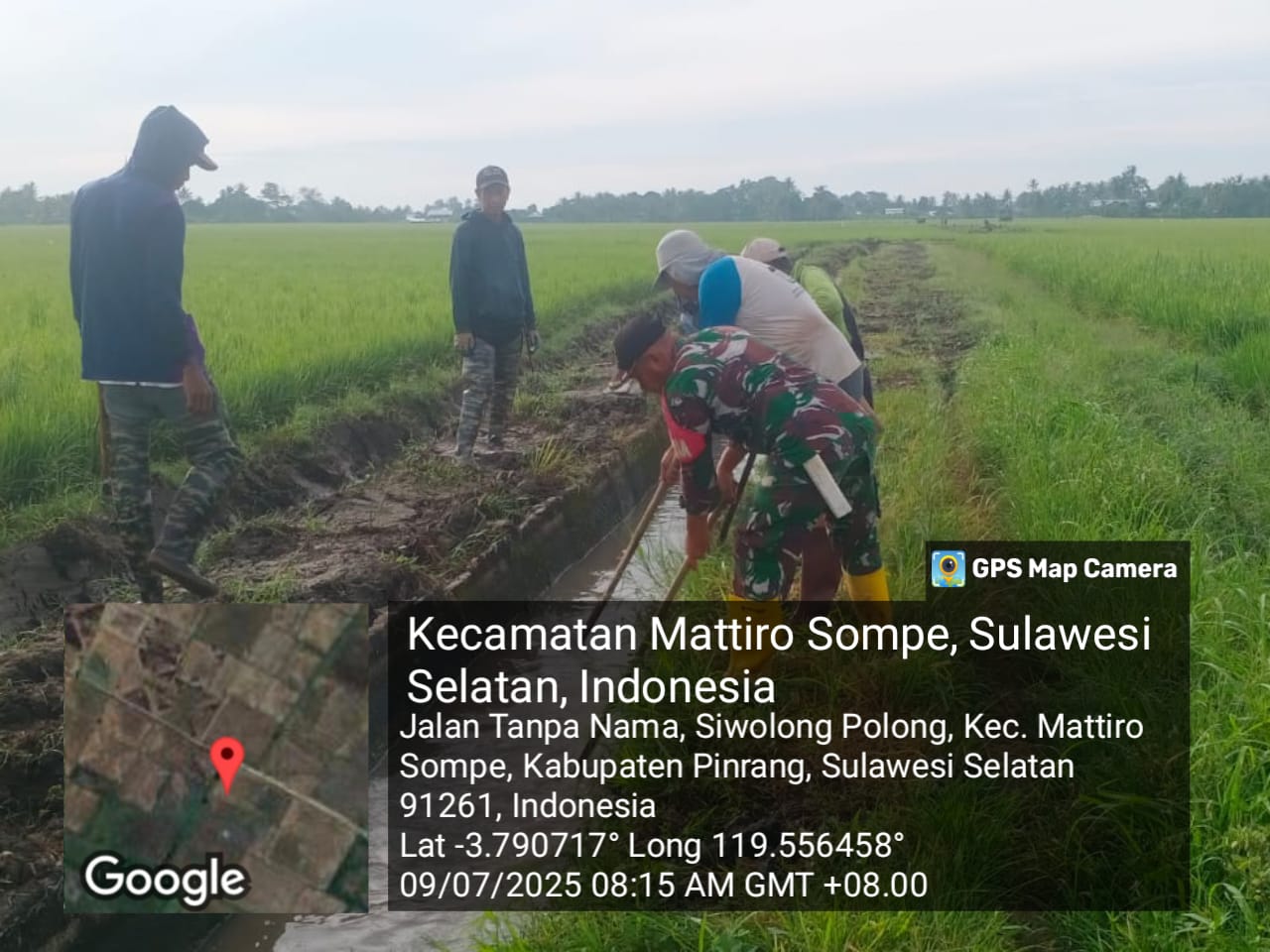 Pinrang_ Babinsa Koramil-02/Mattiro Sompe Kodim 1404/Pinrang Serka Mustaming bersama warga melaksanakan kegiatan kerja bakti membersihkan saluran irigasi di Dusun Kapa Desa Siwolong-polong Kecamatan Mattiro Sompe Kabupaten Pinrang, Rabu (09/07/2025).