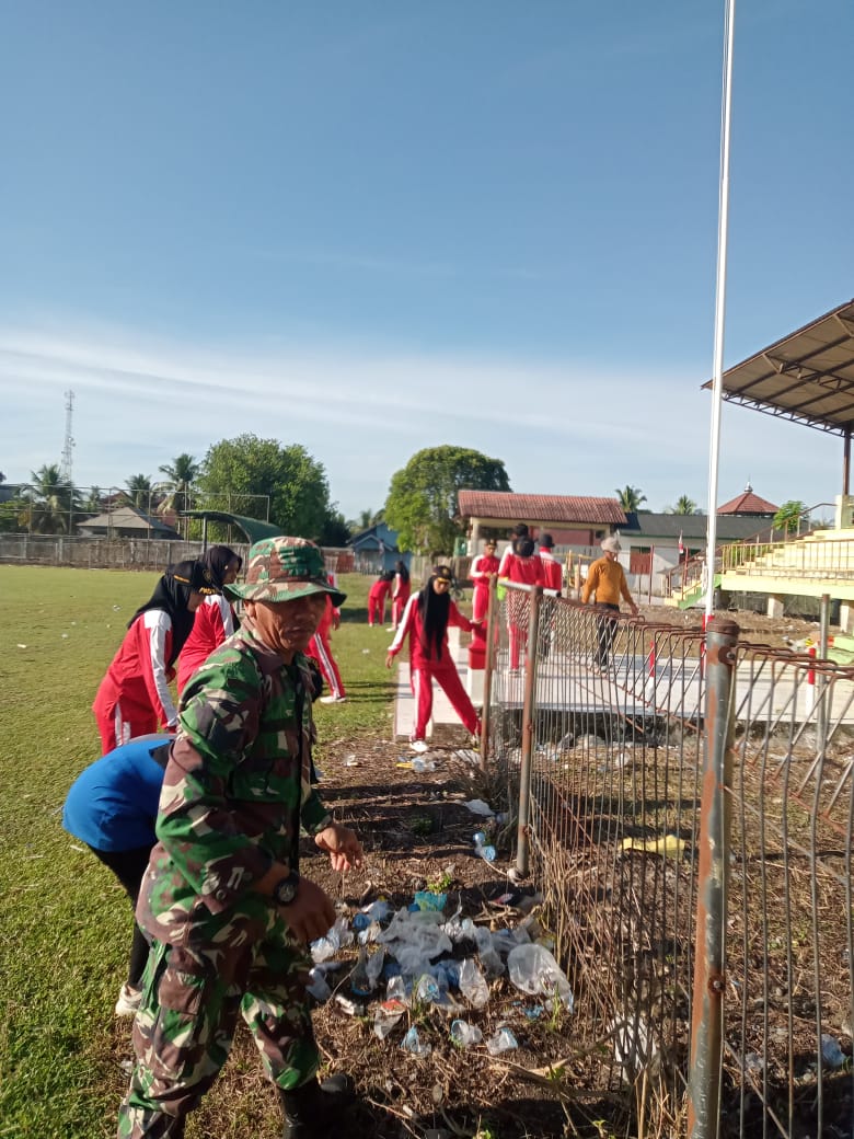 Nagan Raya, Menunjang Persiapan HUT RI Ke 80 Kecamatan Seunagan Serma Budiman bersama Warga Bergotong Royong membersihkan Lapangan yang akan digunakan untuk upacara HUT RI Ke 80 di Desa Pante Cermin Kecamatan Seunagan kabupaten Nagan Raya . Sabtu (16/08/2025).