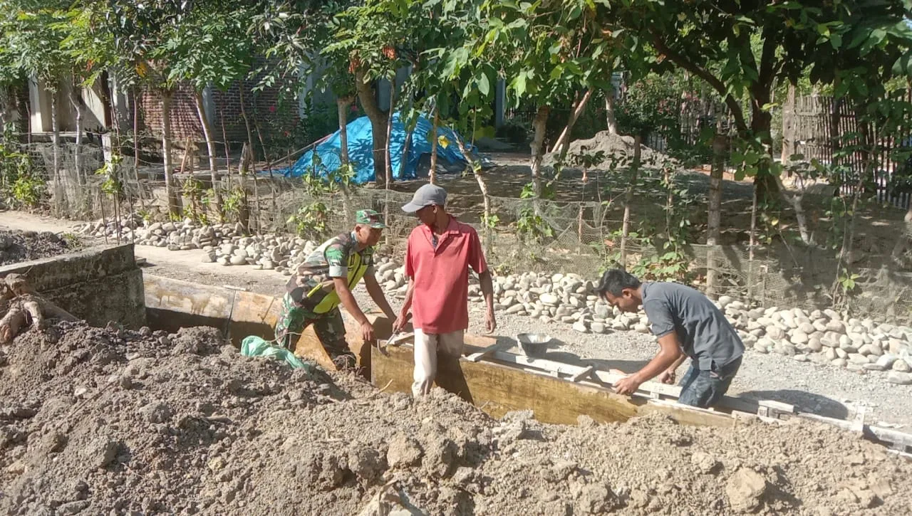 PIDIE — Babinsa Koramil 03/Delima, Kodim 0102/Pidie, Sertu Syukri melaksanakan kegiatan gotong royong bersama warga binaan dalam pengecoran jalan serta pondasi rumah milik salah satu warga di Desa Geudong Reubee, Kecamatan Delima, Kabupaten Pidie, Senin (8/12/2025).