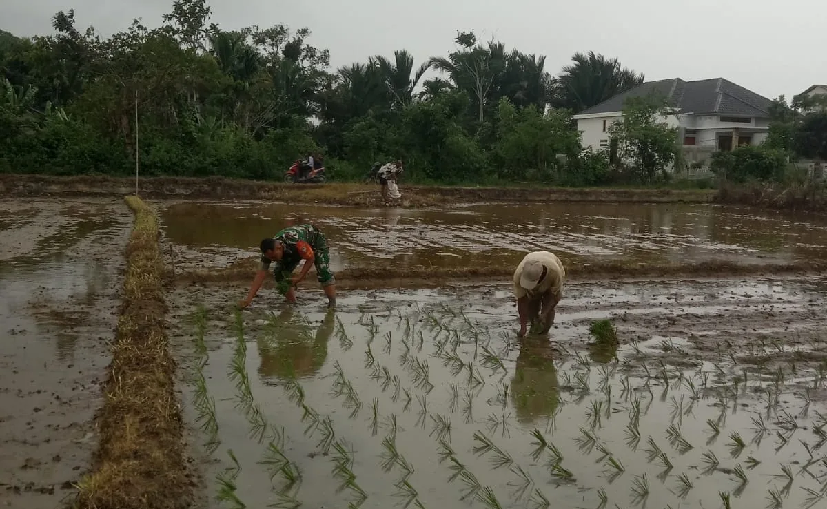 Nagan Raya– Babinsa Koramil 03/Senagan Timur, Kodim 0116/ Nagan Raya, Serda Indra turun langsung ke sawah membantu petani desa binaan menanam padi bertempat di persawahan Desa Sawang mane Kecamatan Senagan Timur, Kabupaten Nagan Raya. Selasa, (2/12/2025).