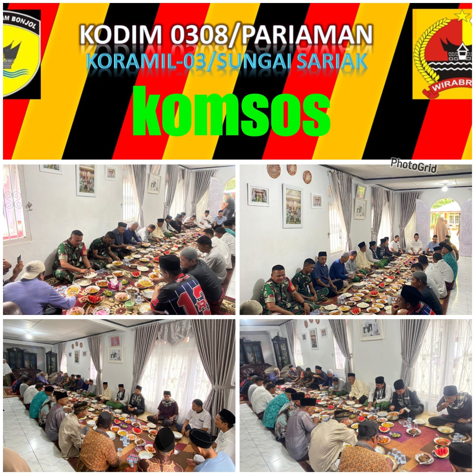 SUNGAI SARIAK, – Babinsa Koramil 03/Sungai Sarik Kodim 0308/Pariaman Koptu Aprisal menghadiri acara syukuran untuk berangkat umroh sekeluarga dari ibuk Idel sebagai ajang komsos dengan Warga Korong Sungai Tareh Nagari Balah Aie Utara Kec VII Koto Sungai Sariak Kab Padang Pariaman, Kamis (21/08/2025).