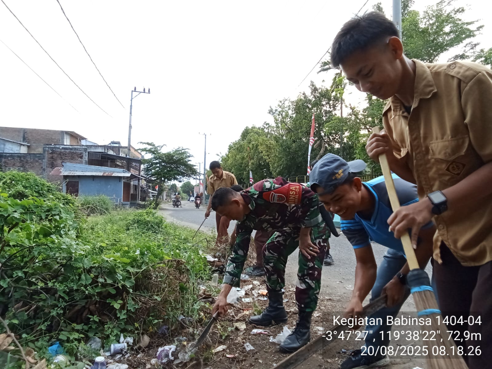 Pinrang_ Peduli kebersihan Lingkungan, Babinsa Koramil-04/Paleteang Kodim 1404/Pinrang Serda Habibi Dalle mengajak anggota Pramuka SMK 2 Pinrang melaksanakan kerja bakti membersihkan sampah-sampah yang berserakan di Jalan Kesehatan Kelurahan Penrang Kecamatan Watang Sawitto Kabupaten Pinrang, Kamis (21/08/2025).