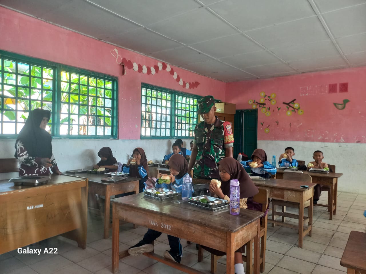 Pinrang_ Babinsa Koramil-05/Patampanua Kodim 1404/Pinrang Sertu Deni Agus Subroto aktif melakukan pendampingan MBG di sekolah yang ada di Desa Malimpung Kecamatan Patampanua Kabupaten Pinrang, Sabtu (13/09/2025).