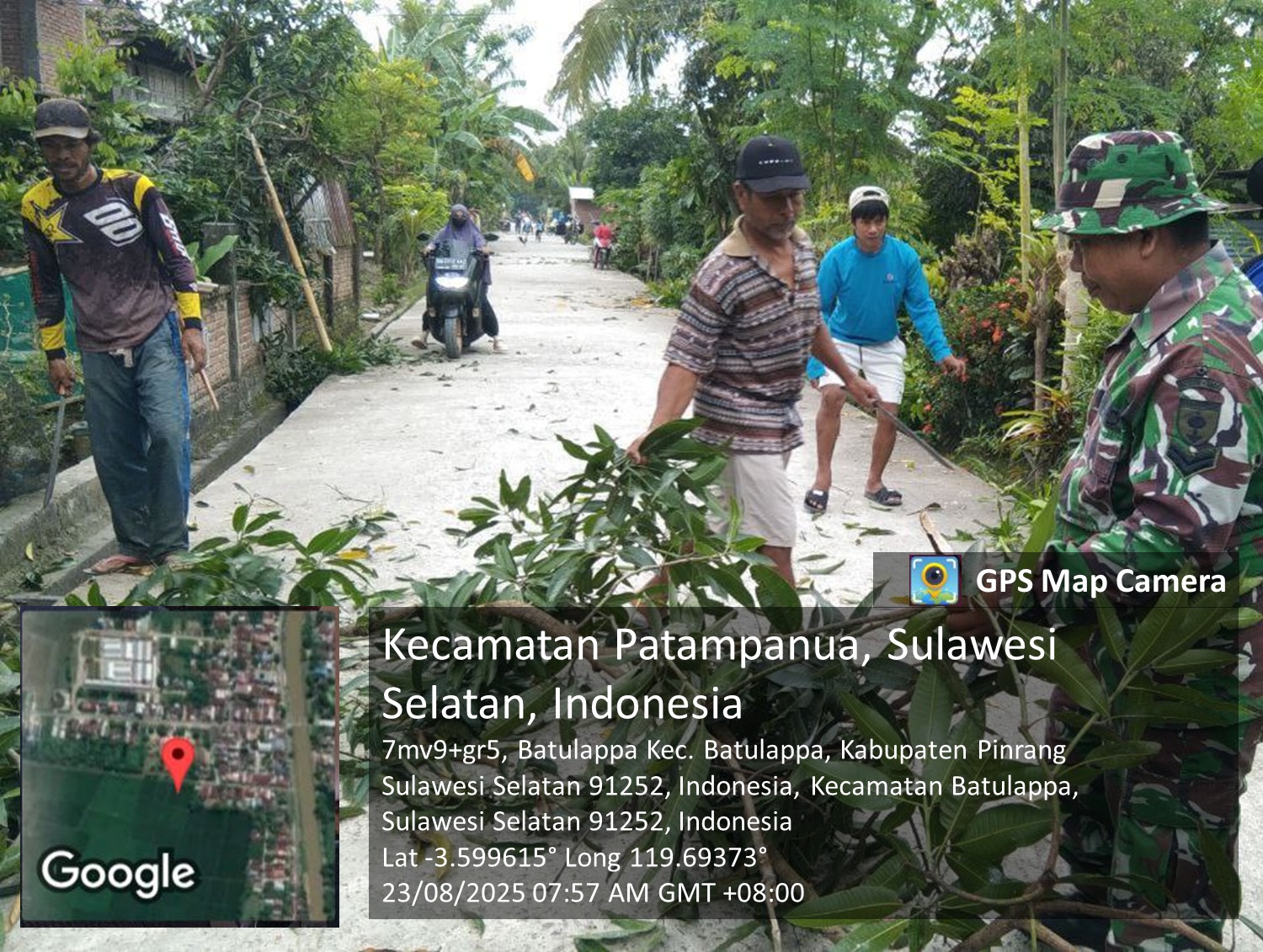 Pinrang_ Kepedulian terhadap lingkungan dan keselamatan warga ditunjukkan oleh Babinsa Koramil-05/Patampanua Kodim 1404/Pinrang Serma Muhammad Hatta saat membantu warga membersihkan ranting pohon yang menutupi jalananan di Desa Batulappa kecamatan Batulappa Kabu[paten Pinrang, Sabtu (23/08/2025).