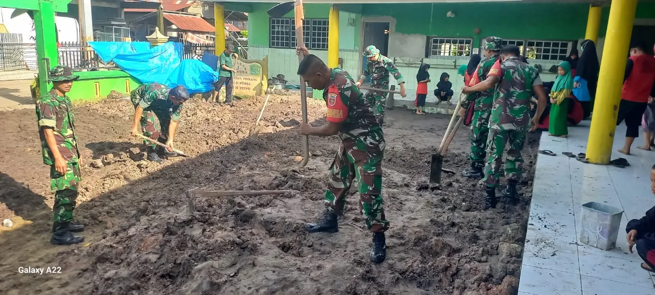 Gotong royong ini mencerminkan semangat kebersamaan dan kepedulian TNI terhadap fasilitas pendidikan di wilayah binaan.