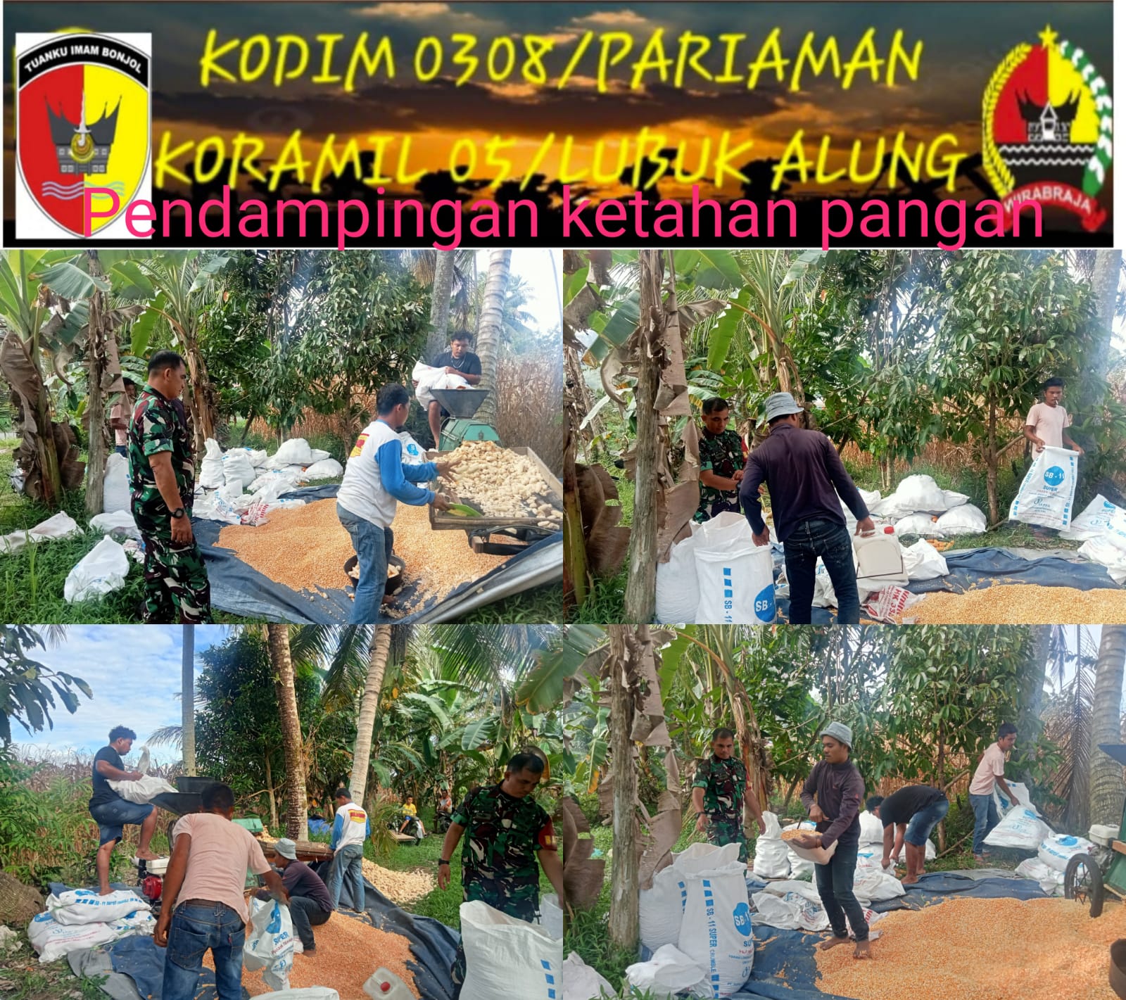 LUBUK ALUNG,- Personil Babinsa Koramil 05/Lubuk alung jajaran Kodim 0307/Pariaman Serka Yumahdi tanjung melaksanakan Pembinaan Ketahanan Wilayah atau Bintahwil dengan membantu salah satu warga binaan merontokkan jagung milik ibuk Ira di korong kampung tangah Nagari Balah hilia, kecamatan Lubuk Alung, kabupaten Padang Pariaman, Jum’at (19/09/25).