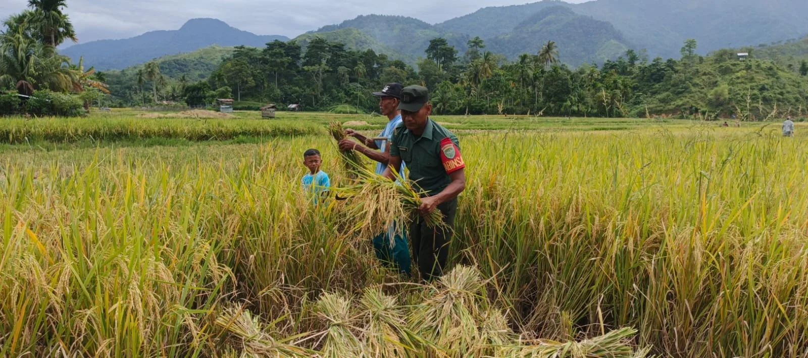 Aceh Selatan – Dalam upaya mendukung ketahanan pangan dan meningkatkan kesejahteraan petani, Babinsa Koramil 05/Samadua Kodim 0107/Aceh Selatan, Sertu Sudahnan, melaksanakan pendampingan kegiatan panen padi serentak di areal persawahan Desa Suaq Hulu, Kecamatan Samadua, Minggu (26/10/2025).