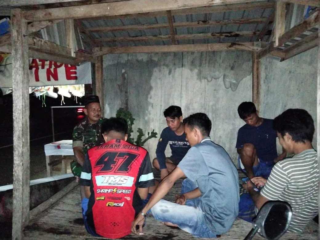 Pinrang_ Babinsa Koramil-06/Duampanua Kodim 1404/Pinrang Sertu Musafir melaksanakan kegiatan jaga Poskamling bersama warga di Desa Kaballangan, Kecamatan Duampanua, Kabupaten Pinrang, Rabu (15/10/2025).