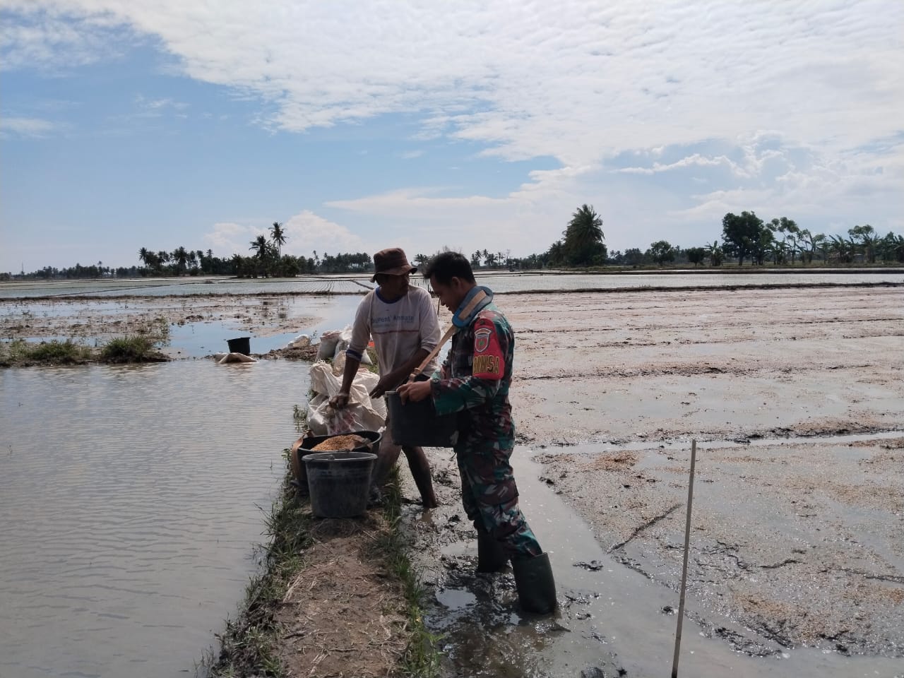 Pinrang_ Babinsa Koramil-06/Duampanua Kodim 1404/Pinrang Sertu Agus membantu salah satu petani menaburkan Bibit Padi di persawahan kelompok tani Tosalame di Lingkungan Taman Sari Kelurahan Tatae Kecamatan Duampanua Kabupaten Pinrang, Sabtu (28/06/2025).