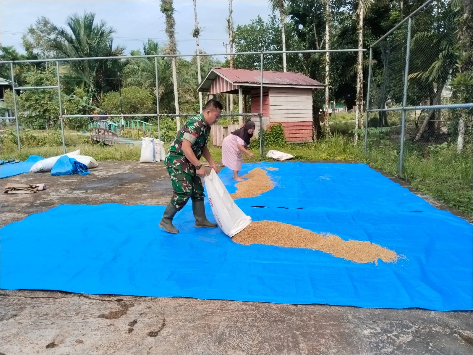 Koptu Apriandi menuturkan kegiatan ini merupakan bentuk kemanunggalan TNI bersama rakyat demi mewujudkan swasembada pangan nasional Babinsa turun ke lapangan membantu petani untuk mengangkut hasil panen padi untuk di jemur.