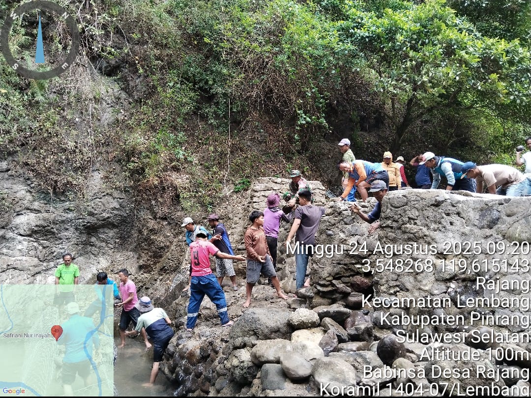 Pinrang_ Babinsa Koramil-07/Lembang Kodim 1404/Pinrang Bersama Warga gotong-royong perbaiki tanggul bendungan yang jebol akibat terdampak banjir saat musim hujan di Desa Rajang Kecamatan Lembang Kabupaten Pinrang, Minggu (24/08/2025).