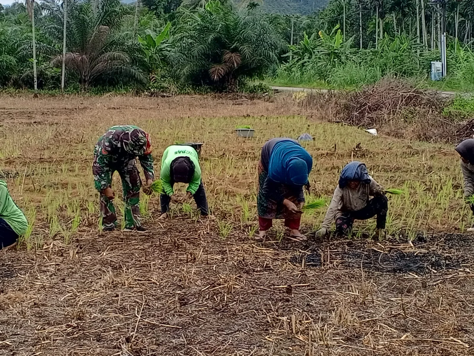 Aceh Selatan – Kepedulian terhadap sektor pertanian kembali ditunjukkan Babinsa Koramil 08/Bakongan Kodim 0107/Aceh Selatan. Kali ini, Babinsa Koptu Budiawan turun ke sawah membantu masyarakat tanam padi di lahan tadah hujan di Desa Alur Duamas Kecamatan Kota Bahagia Kamis (23/10/2025).