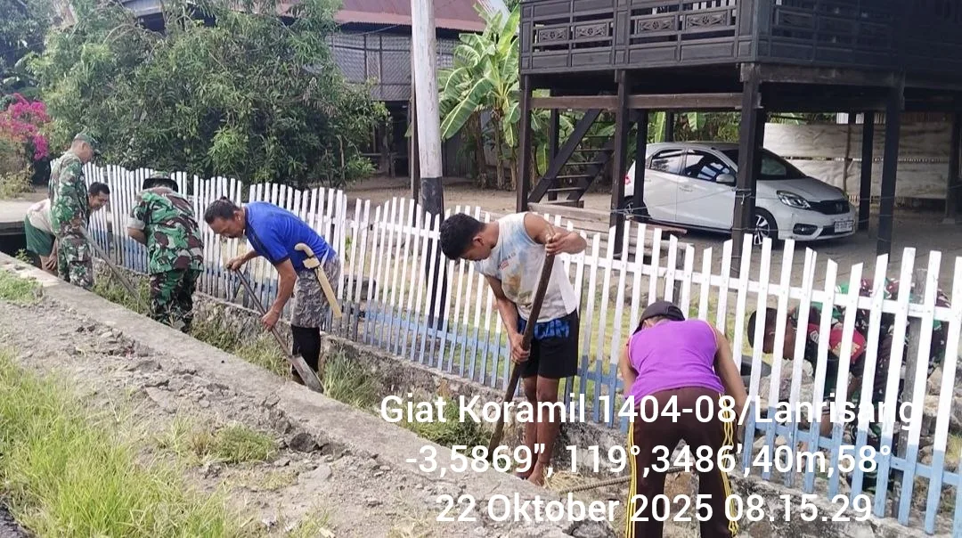 Pinrang_ Babinsa Koramil-08/Lanrisang Kodim 1404/Pinrang melaksanakan kegiatan kerja bakti pembersihan saluran air bersama warga di Dusun Padang Lampe, Desa Samaulue, Kecamatan Lanrisang, Kabupaten Pinrang, Rabu (22/10/2025).