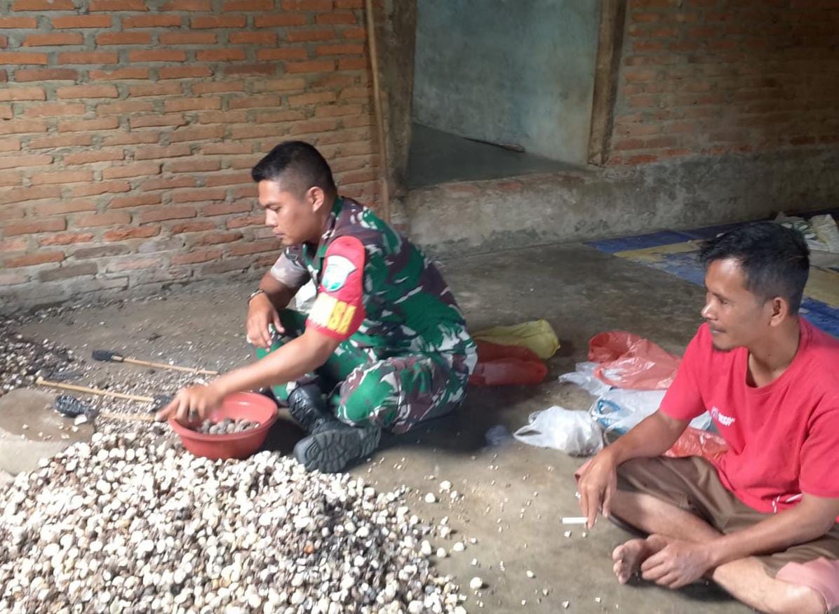 Babinsa Koramil 11/Kluet Tengah Bantu Warga Kupas Kemiri di Desa Binaan