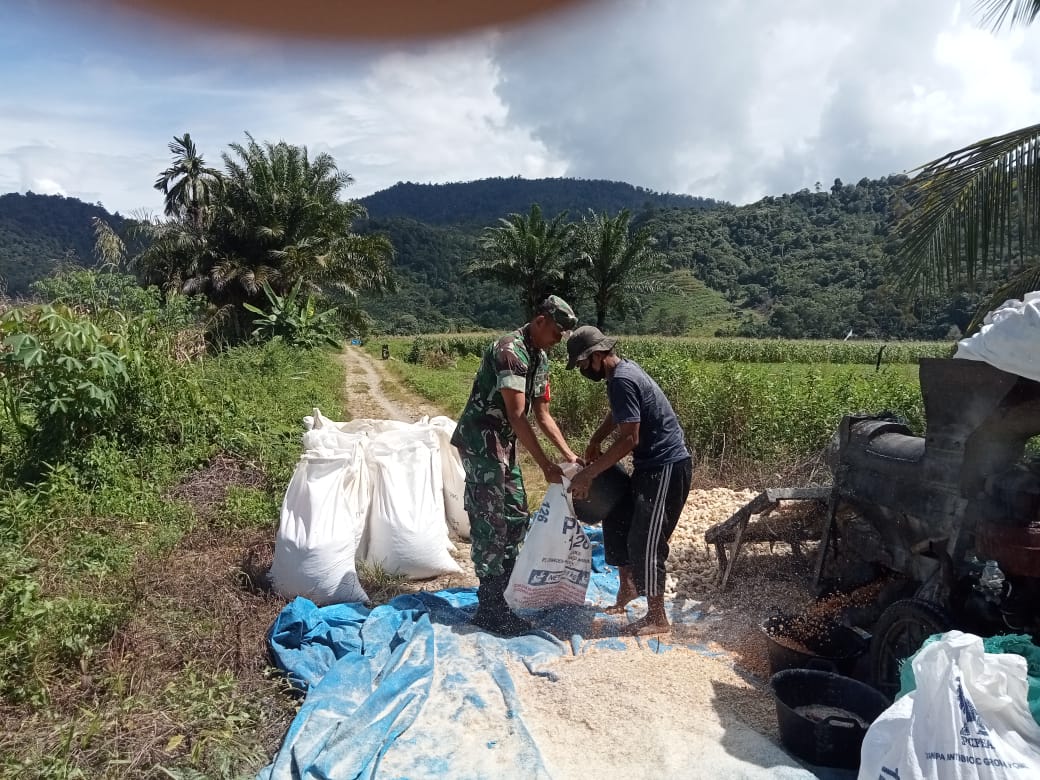 Babinsa Koramil 13/Kluet Timur Dampingi Petani Giling Jagung Langsung di Area Perkebunan Seusai Panen