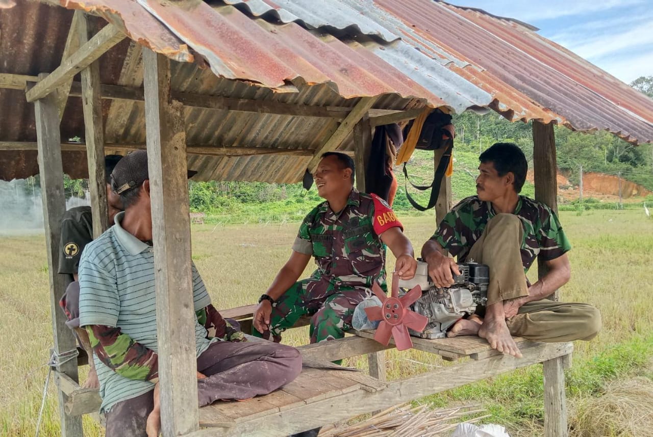 ACEH SELATAN – Dalam upaya mempererat hubungan dengan masyarakat desa binaan sekaligus mendukung program ketahanan pangan, Babinsa Koramil 14/Pasi Raja Serda Sulomo berbincang santai bersama para petani di sebuah pondok sawah di Desa Kruemg Kale Kecamatan Pasi Raja, Minggu (7/9/2025).