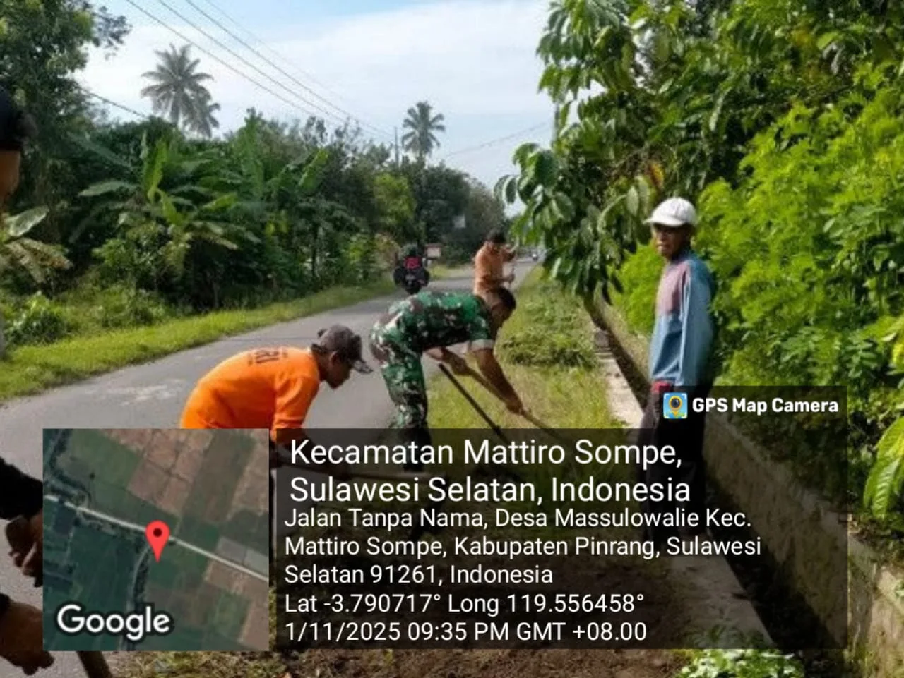 Pinrang_ Dalam upaya menjaga kebersihan lingkungan dan mempererat kemanunggalan TNI dengan rakyat, Babinsa jajaran Koramil 1404-02/Mattiro Sompe Kodim 1404/Pinrang melaksanakan kegiatan Karya Bakti bersama masyarakat di Dusun Sekkang, Desa Massulowalie, Kecamatan Mattiro Sompe, Kabupaten Pinrang, Selasa (04/11/2025).