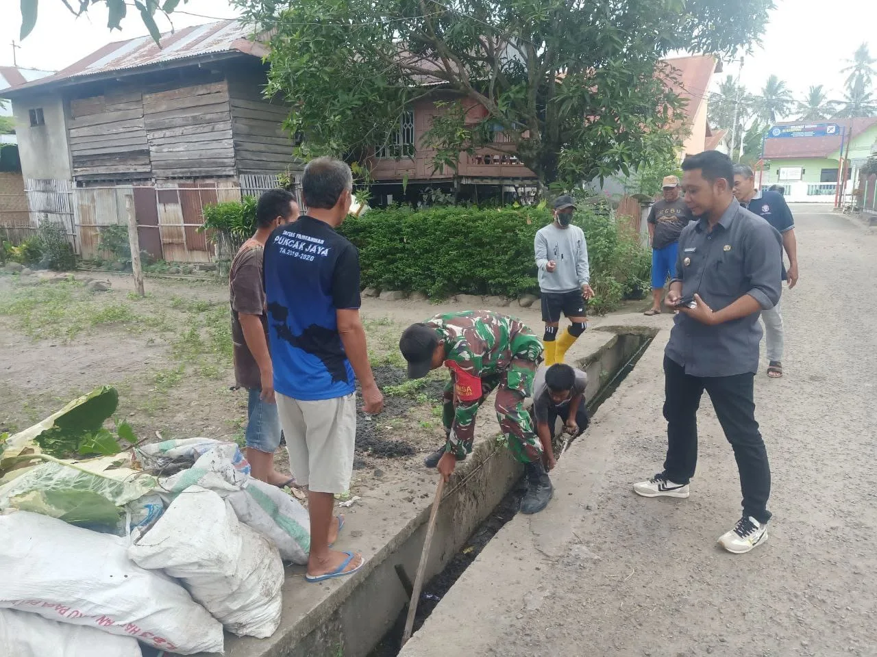 Kegiatan kerja bakti ini difokuskan pada pembersihan selokan dari sampah dan endapan lumpur yang dapat menghambat aliran air. Dengan menggunakan peralatan sederhana, Babinsa dan masyarakat tampak kompak bergotong royong membersihkan saluran air agar kembali berfungsi dengan baik.