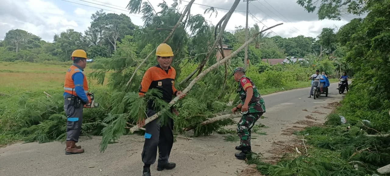 Mengetahui kondisi tersebut, Babinsa dengan sigap mengambil tindakan cepat bersama warga sekitar untuk memindahkan pohon tumbang dari badan jalan. Dengan peralatan seadanya dan semangat gotong royong, pohon berhasil dipindahkan sehingga akses jalan kembali normal dan aman dilalui oleh kendaraan maupun pejalan kaki.
