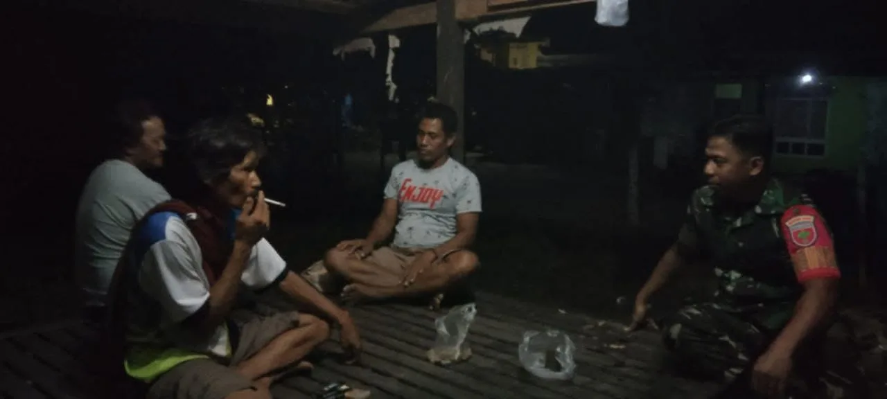 Pinrang_ Babinsa Koramil-05/Patampanua Kodim 1404/Pinrang, Sertu Mustari, melaksanakan kegiatan patroli malam dan komsos dengan warga di Kelurahan Benteng, Kecamatan Patampanua, Kabupaten Pinrang, Rabu (22/10/2025).