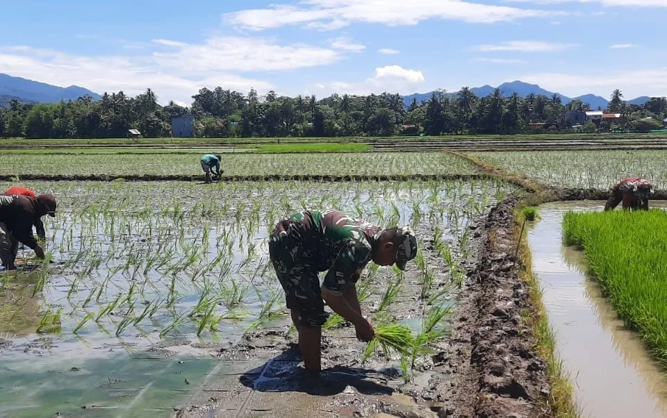 Pinrang_ Dalam rangka mendukung program ketahanan pangan nasional, Babinsa Koramil 1404-07/Lembang Kodim 1404/Pinrang, Sertu Ismail Malla, melaksanakan pendampingan pertanian dengan membantu petani menanam padi di wilayah binaan, tepatnya di Dusun Rantoni, Desa Pakeng, Kecamatan Lembang, Kabupaten Pinrang, Minggu (18/01/2026).