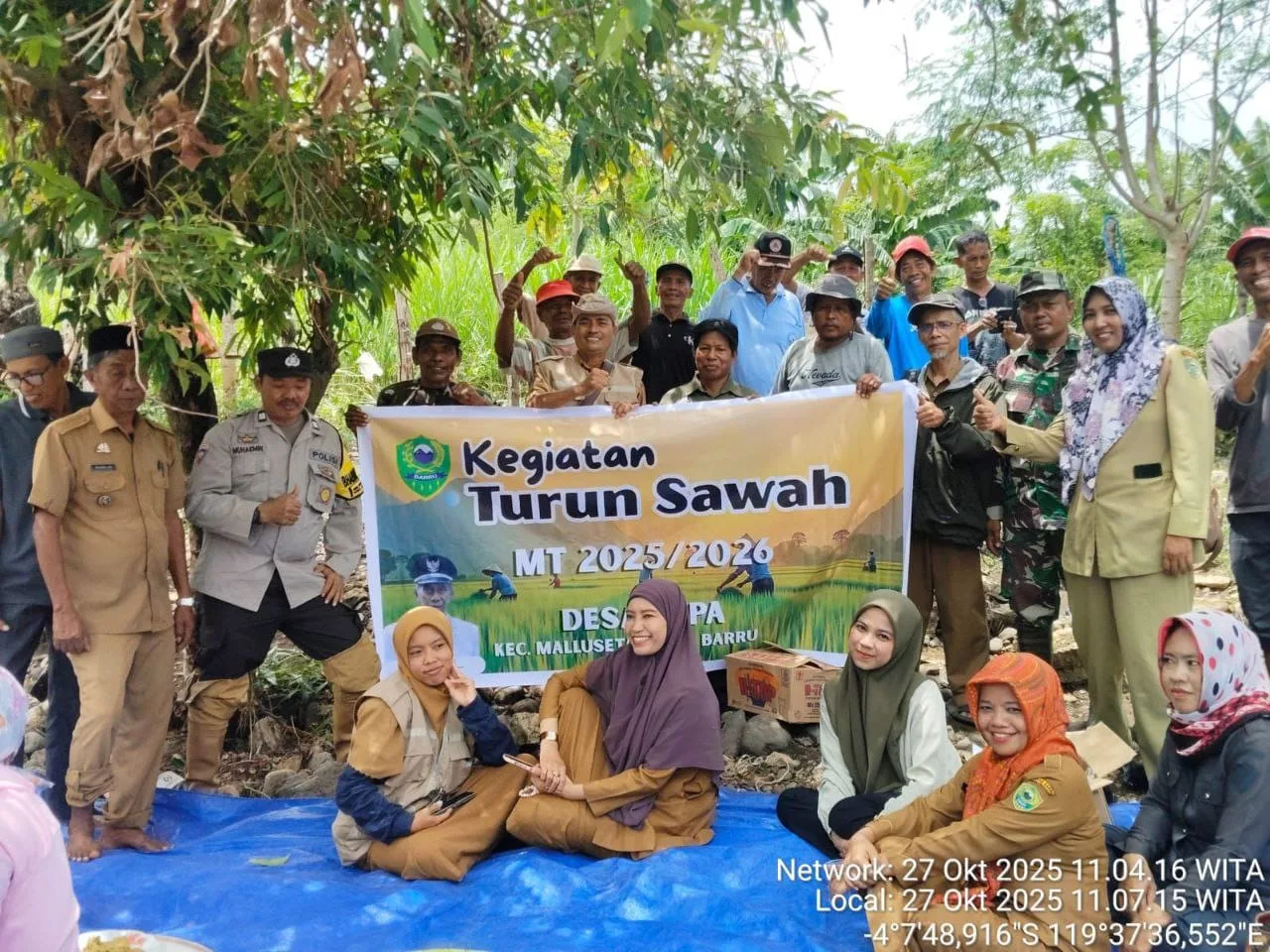 KODIM 1405/PAREPARE — Babinsa Koramil 1405-05/Mallusetasi, Pelda Syaripuddin, menghadiri undangan kegiatan Turun Sawah Musim Tanam 2025/2026 yang digelar di aliran Sungai Labujung, Dusun Kupa, Desa Kupa, Kecamatan Mallusetasi, Kabupaten Barru.