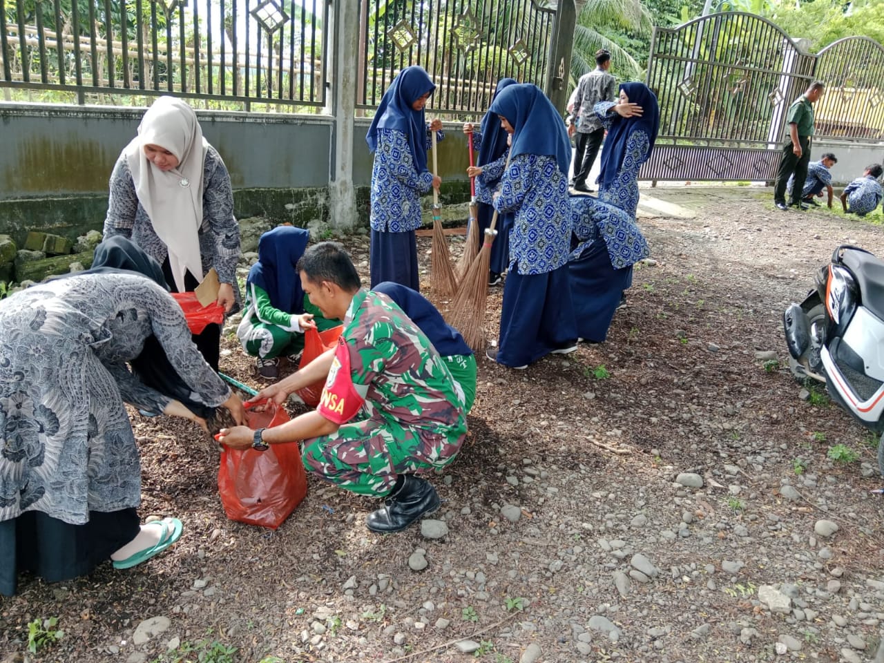 Pidie – Dalam rangka menanamkan semangat kebersamaan serta meningkatkan kepedulian terhadap lingkungan, Bintara Pembina Desa (Babinsa) Koramil 15/Tiro, Sertu K.M. Lase, melaksanakan kegiatan gotong royong bersama siswa dan siswi SMP Negeri 1 Tiro di Desa Lhok Igeuh, Kecamatan Tiro, Kabupaten Pidie, Kamis (25/09/2025).