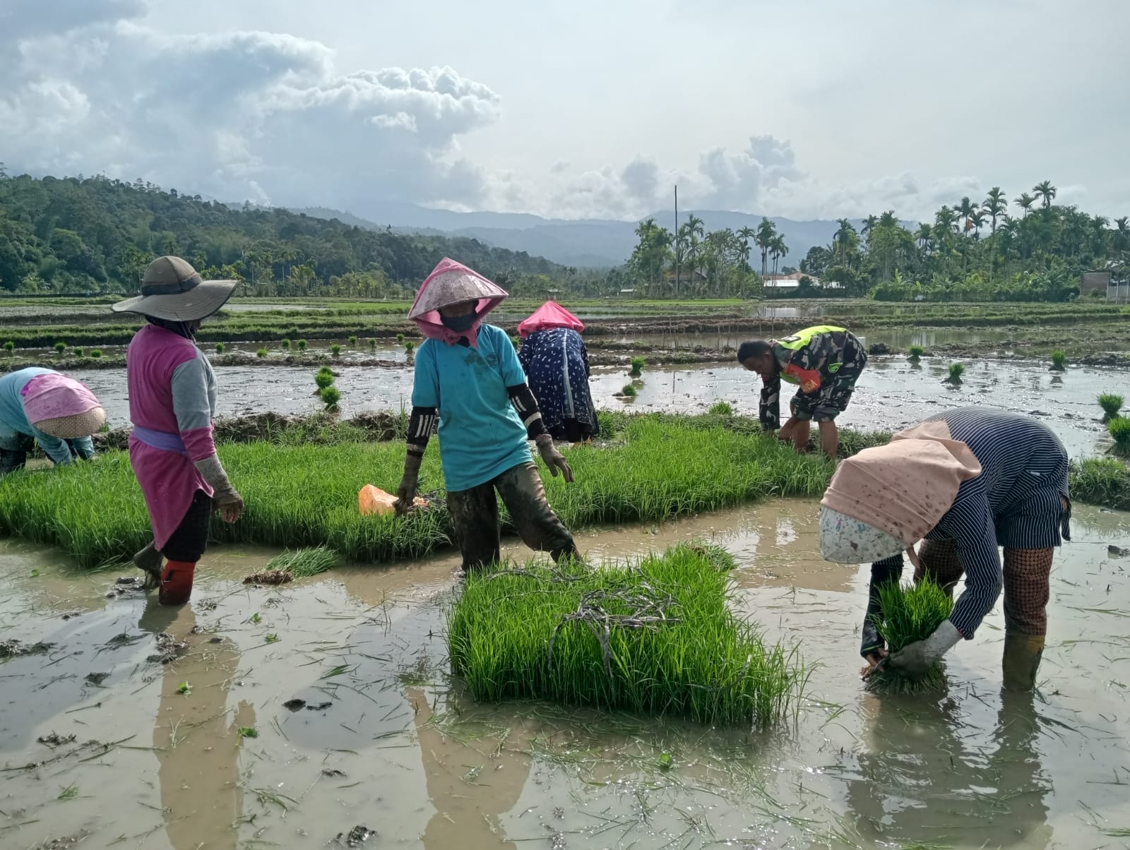 Pidie – Sebagai bentuk kepedulian terhadap ketahanan pangan nasional sekaligus mempererat kemanunggalan TNI dengan rakyat, Bintara Pembina Desa (Babinsa) Koramil 16/Tangse Kodim 0102/Pidie, Koptu Dedi Sejahtera, turun langsung membantu masyarakat menanam padi di areal persawahan Gampong Peunalom II, Kecamatan Tangse, Kabupaten Pidie, Sabtu (13/09/2025).