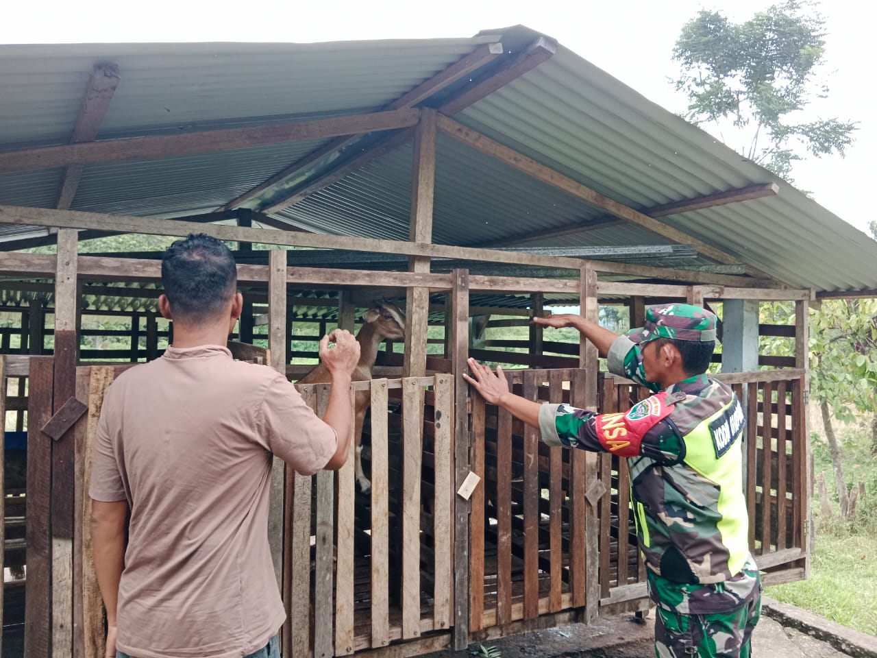 Pidie – Upaya mendukung ketahanan pangan dan meningkatkan perekonomian masyarakat terus dilakukan TNI AD melalui peran Bintara Pembina Desa (Babinsa). Salah satunya ditunjukkan oleh Babinsa Koramil 16/Tangse, Kodim 0102/Pidie, Sertu Rahmat Mulyadi yang melaksanakan pendampingan serta pengecekan peternakan kambing milik Hendri Prayetno, pemuda produktif asal Gampong Keude Tangse, Kabupaten Pidie.Senin (01/09/25).